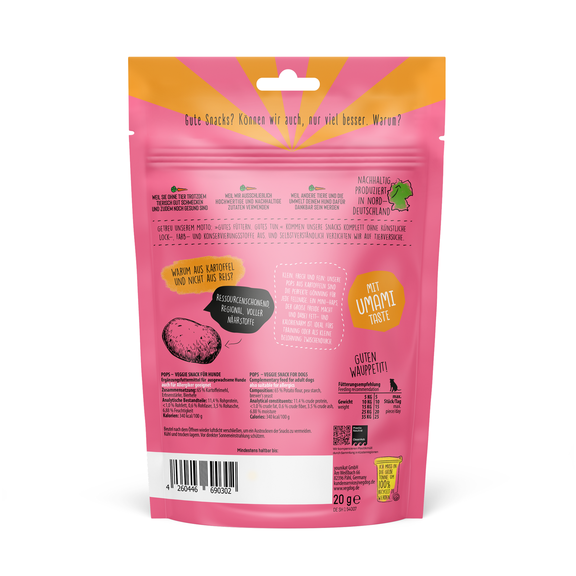 Unsere POPS aus Kartoffeln sind die perfekte Gönnung für jede Fellnase. Ein Mini-Haps, der große Freude macht und dabei fettarm ist. Ideal als effizienter Trainingssnack mit weniger als 1 kcal pro Stück oder als knusprig-leichte Belohnung für zwischendurch - sogar für Senioren oder Hunde mit Kauproblemen. Also: Snacken ohne Reue! (Wir wissen, das klingt fast zu schön, um wahr zu sein). Im Unterschied zu anderen Hundepopcorns enthalten die POPS Kartoffeln statt Reis – schmeckt hervorragend, ist dazu noch leicht verdaulich und damit auch für sensible Hundemägen geeignet. Außerdem werden beim Kartoffelanbau weniger klimaschädliche Gase freigesetzt und der Ressourcenverbrauch vermindert, weil weniger Wasser und Pestizide benötigt werden. Darüber hinaus stammt die Kartoffel wie alle weiteren Zutaten aus Deutschland, und die Produktion findet in Norddeutschland statt.